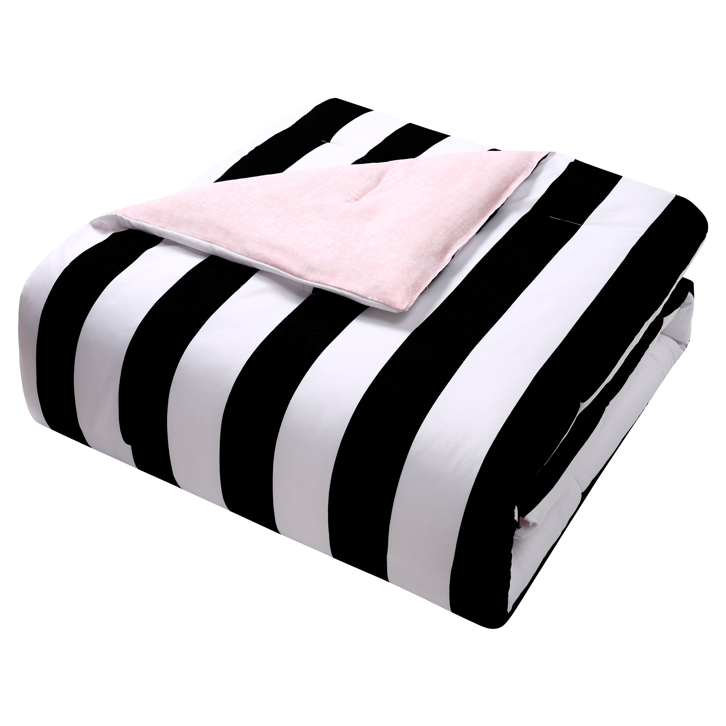 Bring effortless luxury into your bedroom with the Juicy Couture Cabana Stripe Reversible bedding set. This set features bold stripes with a distressed reversible print on super-soft fabric that makes this as comfortable as it is stylish. The bedding set comes with three fun decorative pillows that feature gold embroidery and pleats.