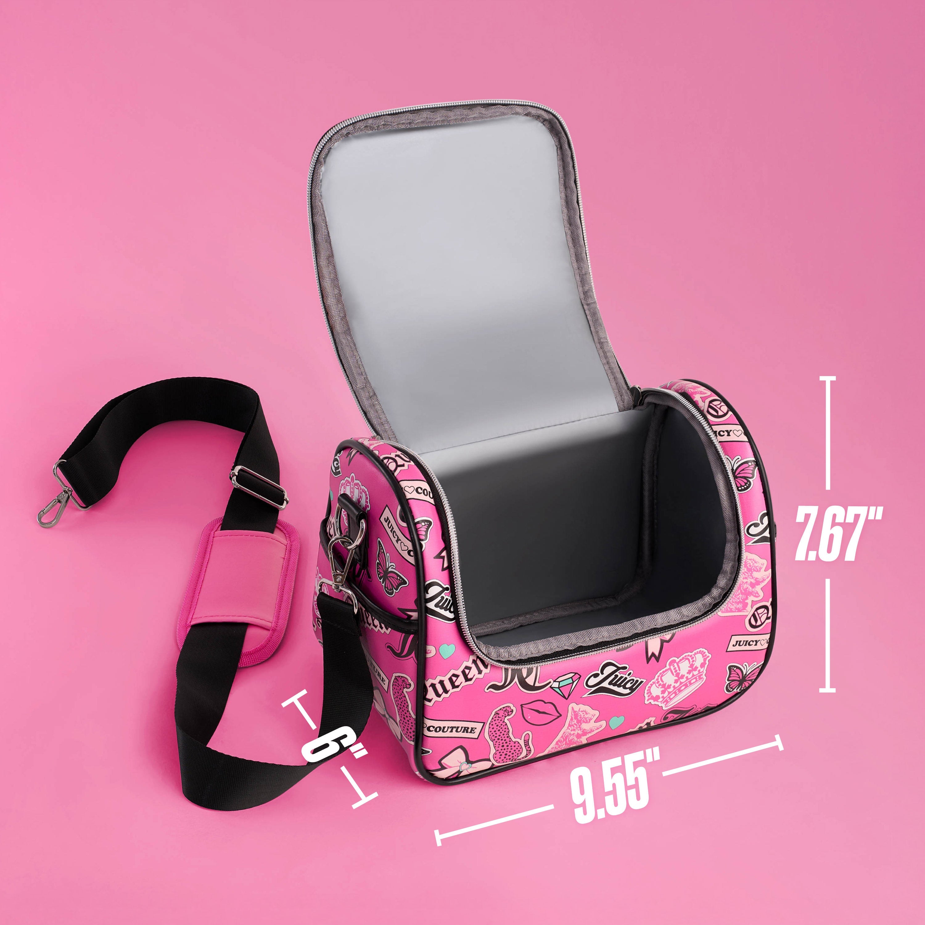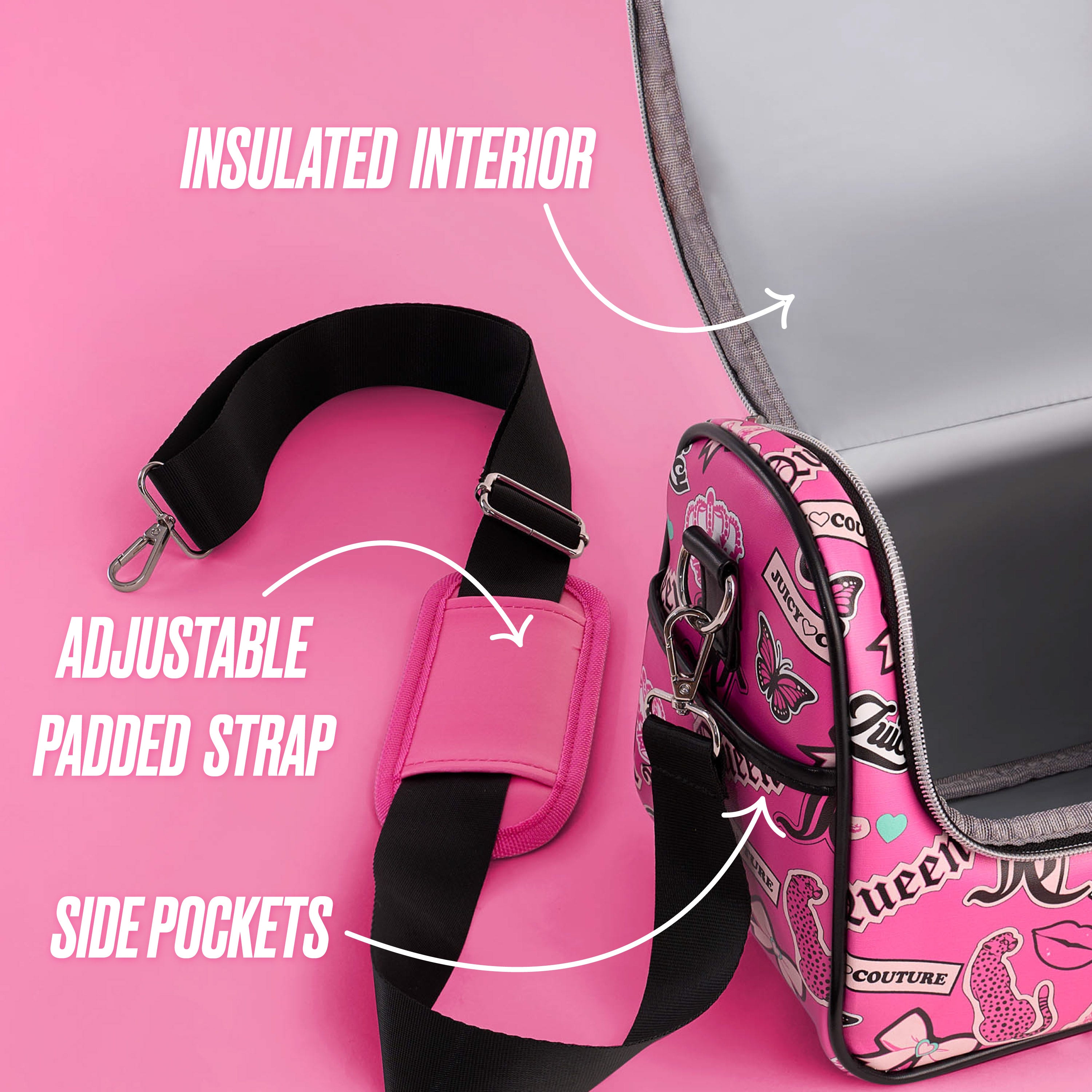 Stay stylish on the go with the Juicy Couture Lunch Purse Bag Cooler, featuring an embossed PU design, black trim, and signature Juicy flair. The insulated interior keeps your meals hot or cold, while the spacious compartment fits up to six cans with ease. Designed for convenience, it includes a top handle, adjustable padded strap, side pocket, and a cham zipper closure—perfect for work, school, or weekends out.
