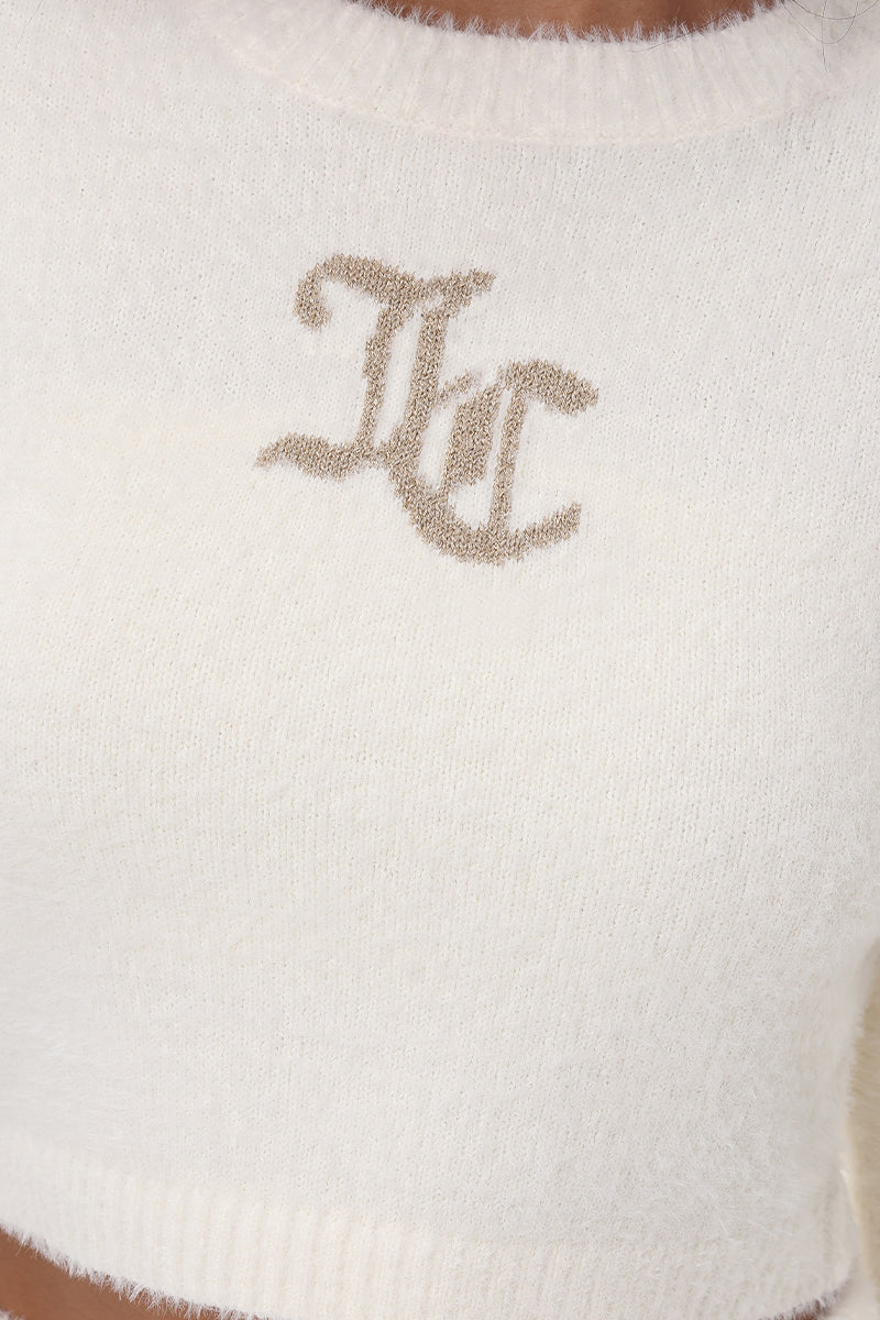 Shimmering metallic threads with a hint of gold logo lend a party-ready vibe to an eyelash off the shoulder sweater offering a glamorous appearance.