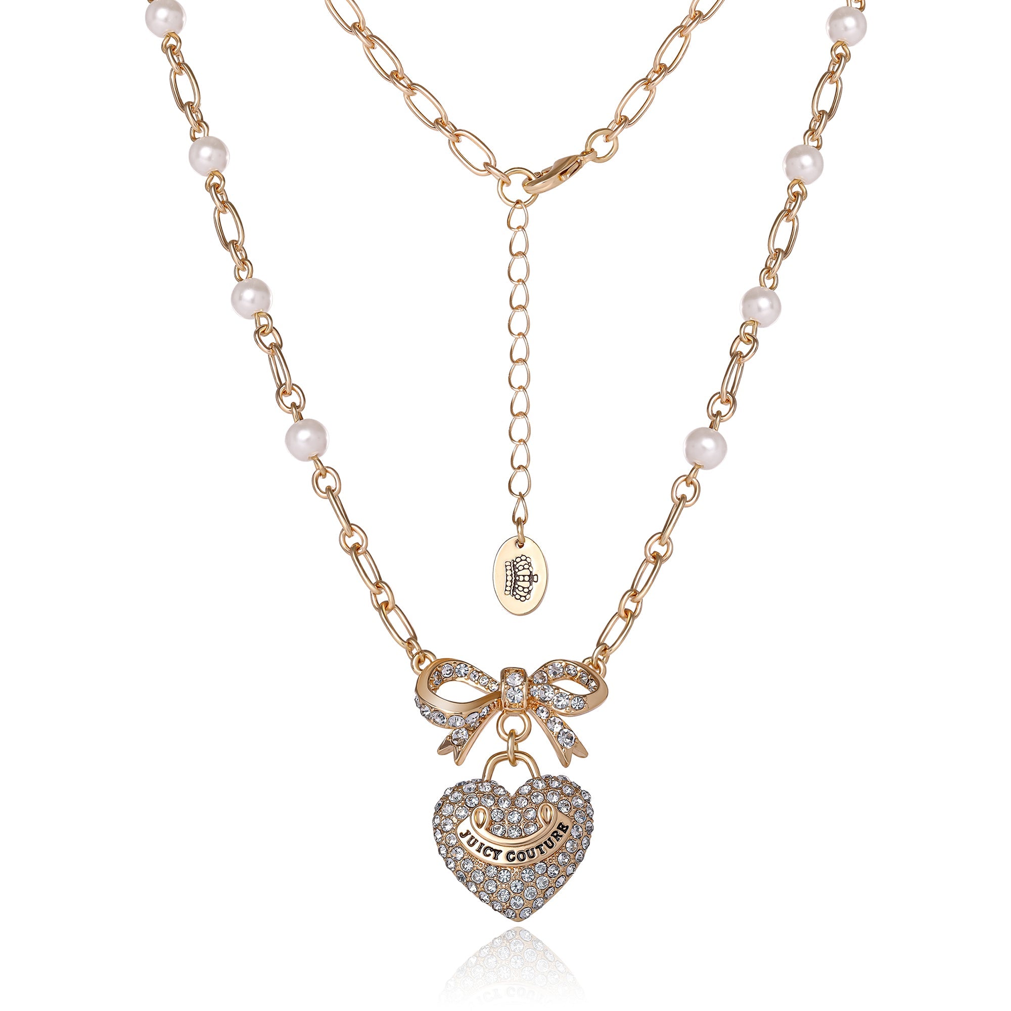 Elevate your elegance with the Juicy Couture Goldtone Pearl Heart Pendant Necklace. This stunning piece features delicate pearl accents along a chic Goldtone chain, with a sparkling heart pendant adorned with crystal embellishments and a dainty bow. Whether worn alone or layered, this necklace adds a timeless and glamorous touch to any outfit. Perfect for special occasions or everyday luxury.