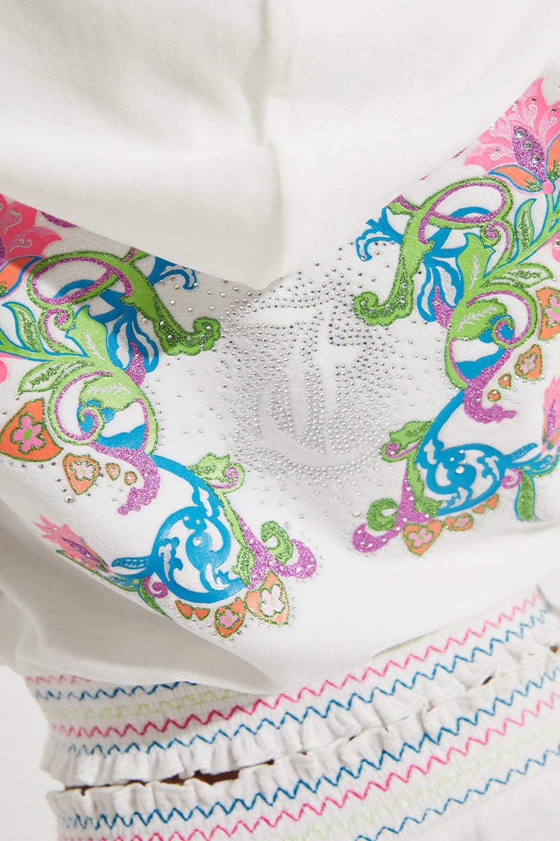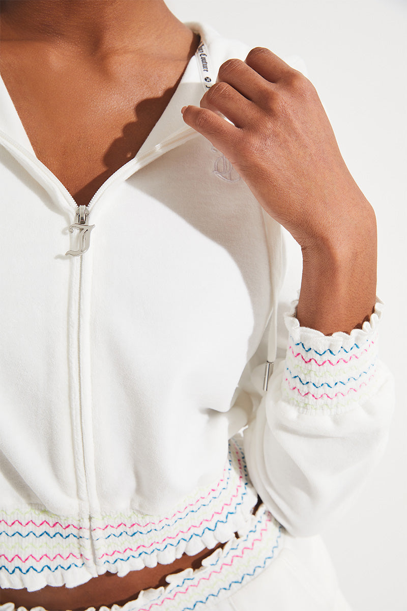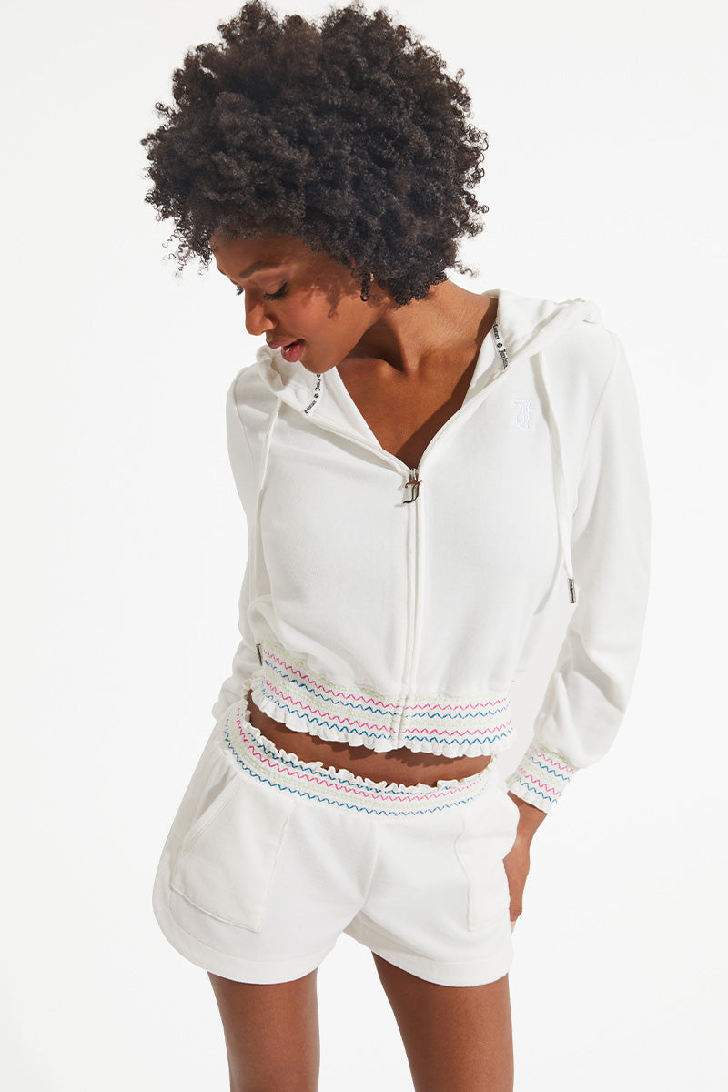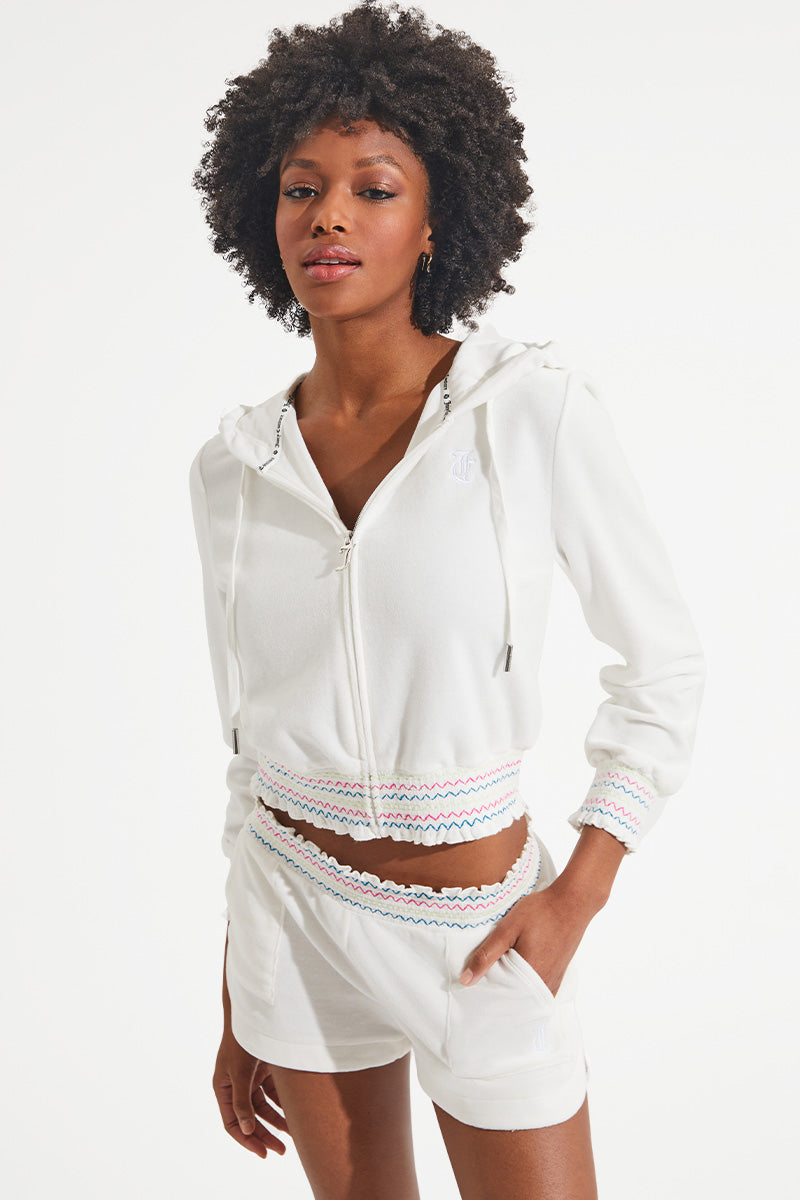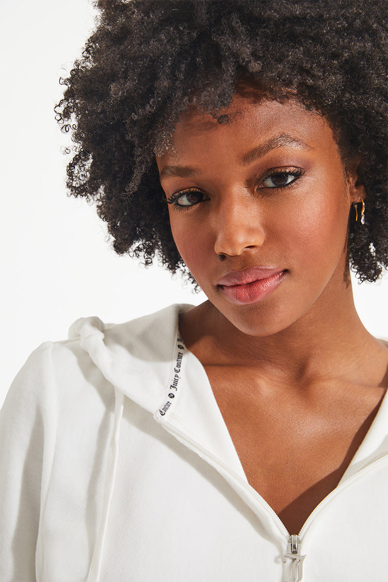 Our cozy cotton velour hoodie is getting a major upgrade, featuring a waist-accentuating smock hem and a color foil back graphic. Perfect for those warmer days and cooler nights, this hoodie will be your new go-to for both comfort and style.