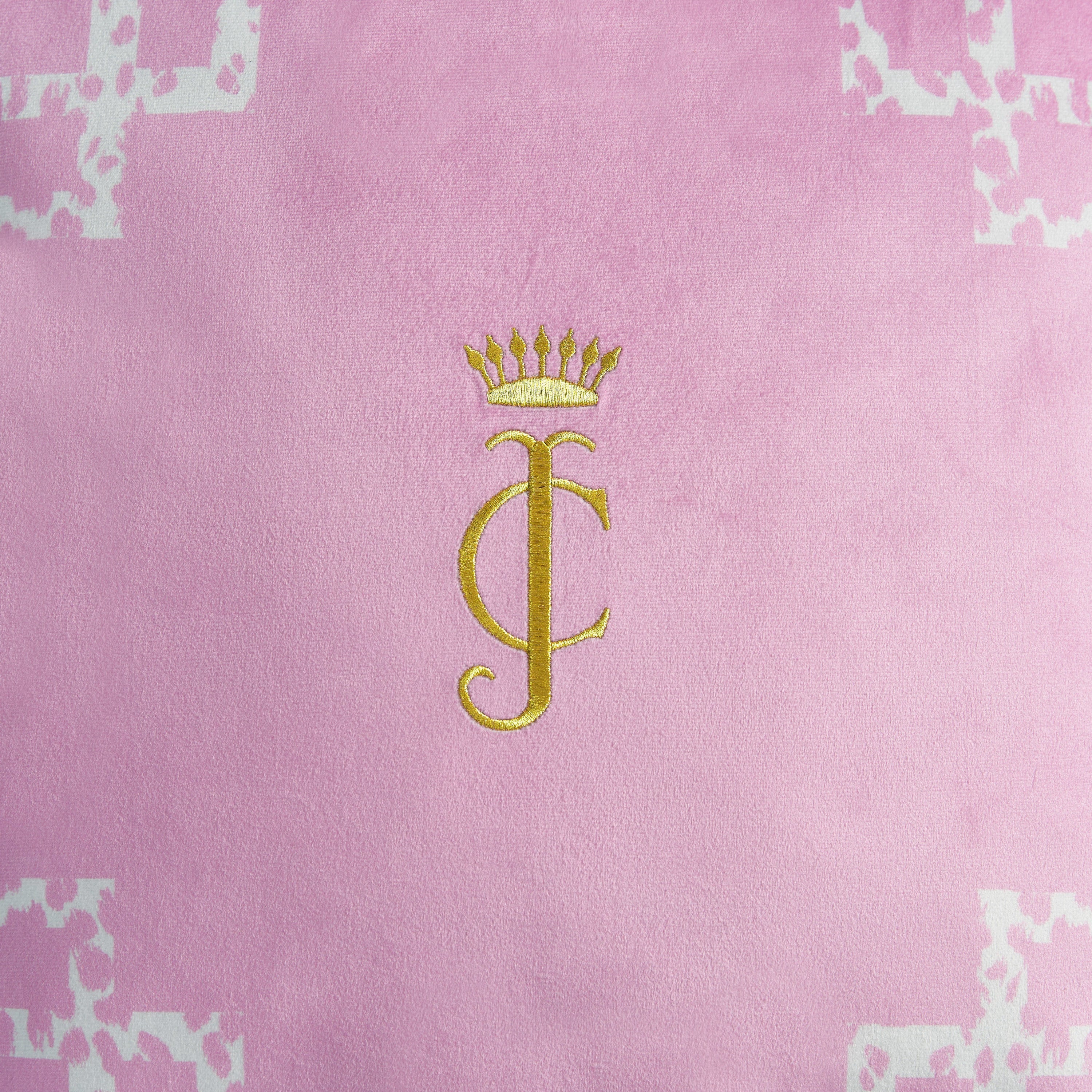 The sophisticated Juicy Couture Lattice Embroidered Velvet Throw Pillow will elevate any part of your home. This rich black pillow features a chic monochrome cheetah print lattice border, showcasing a regal JC logo embroidered in gold thread.