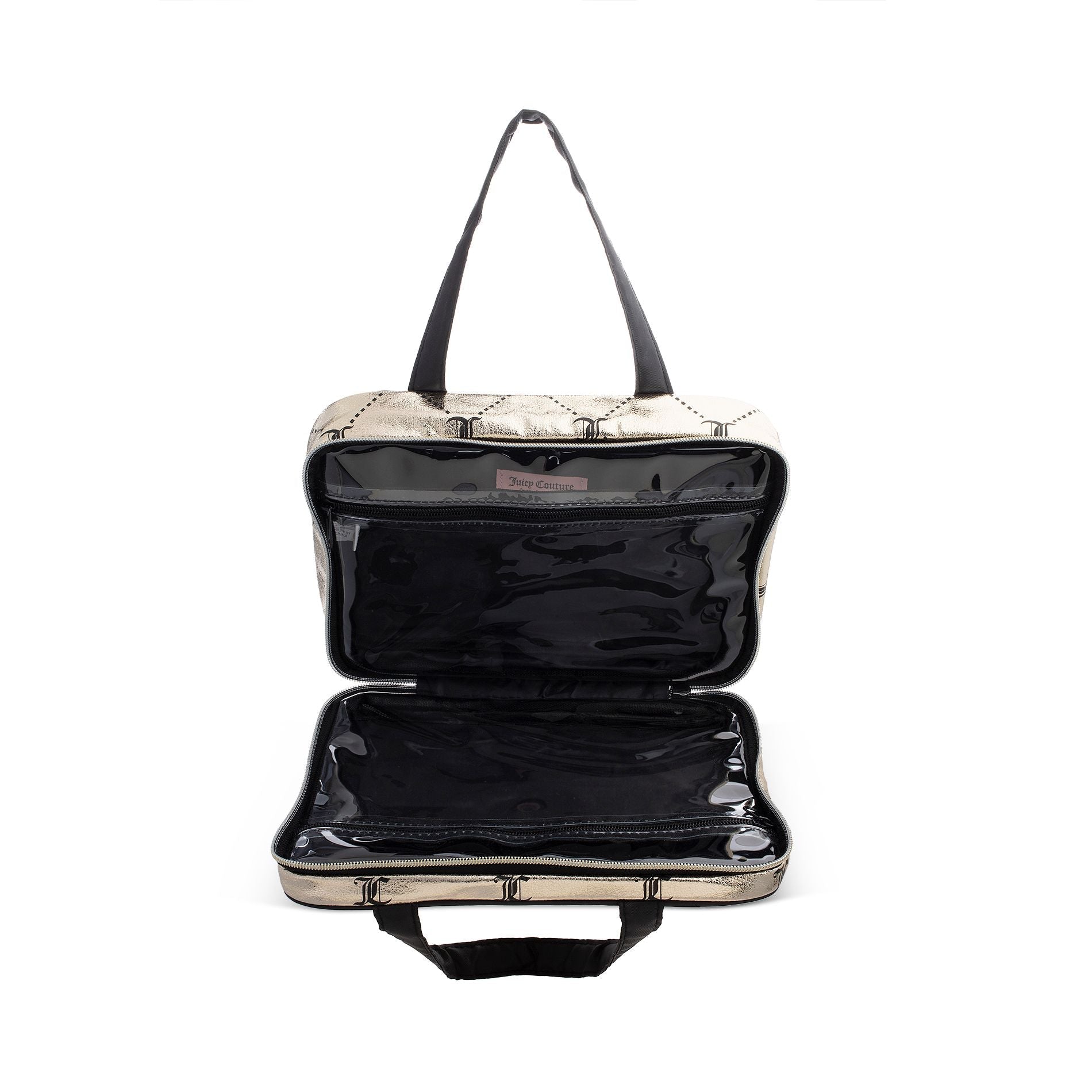 Headed out of town? Bring this metallic gold juicy logo print weekender. The perfect travel companion.